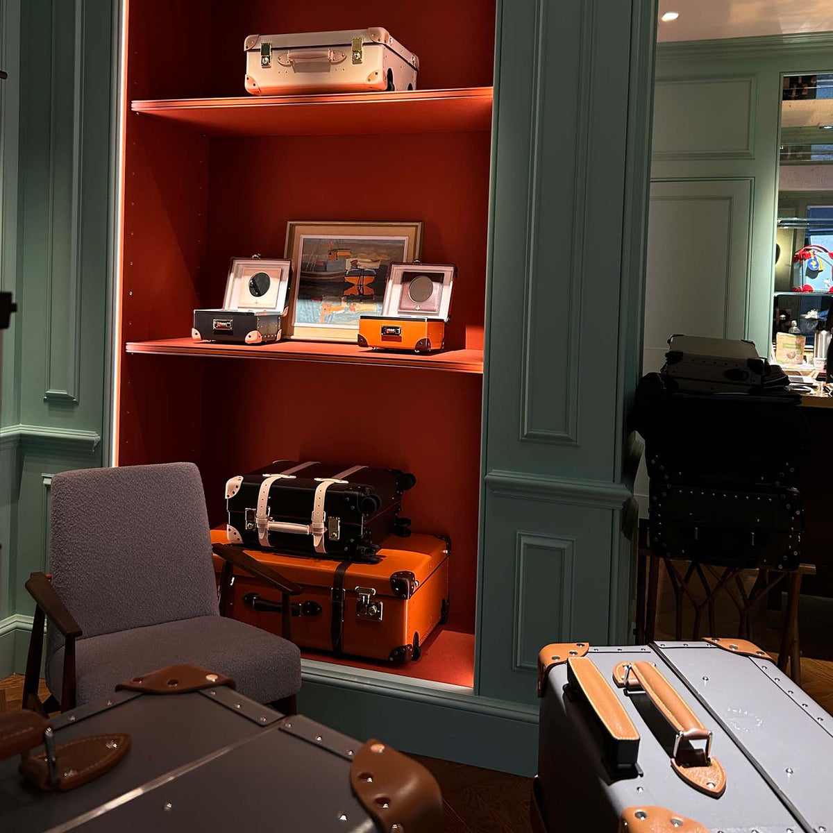 We chose a vibrant colour for the walls – Cambridge Blue - first familiar in the early 1800’s - which presented the ideal backdrop tone to accentuate the endless possibilities available with the Globe-Trotter collection as well as offering a nod to the brighter new hues in the range.