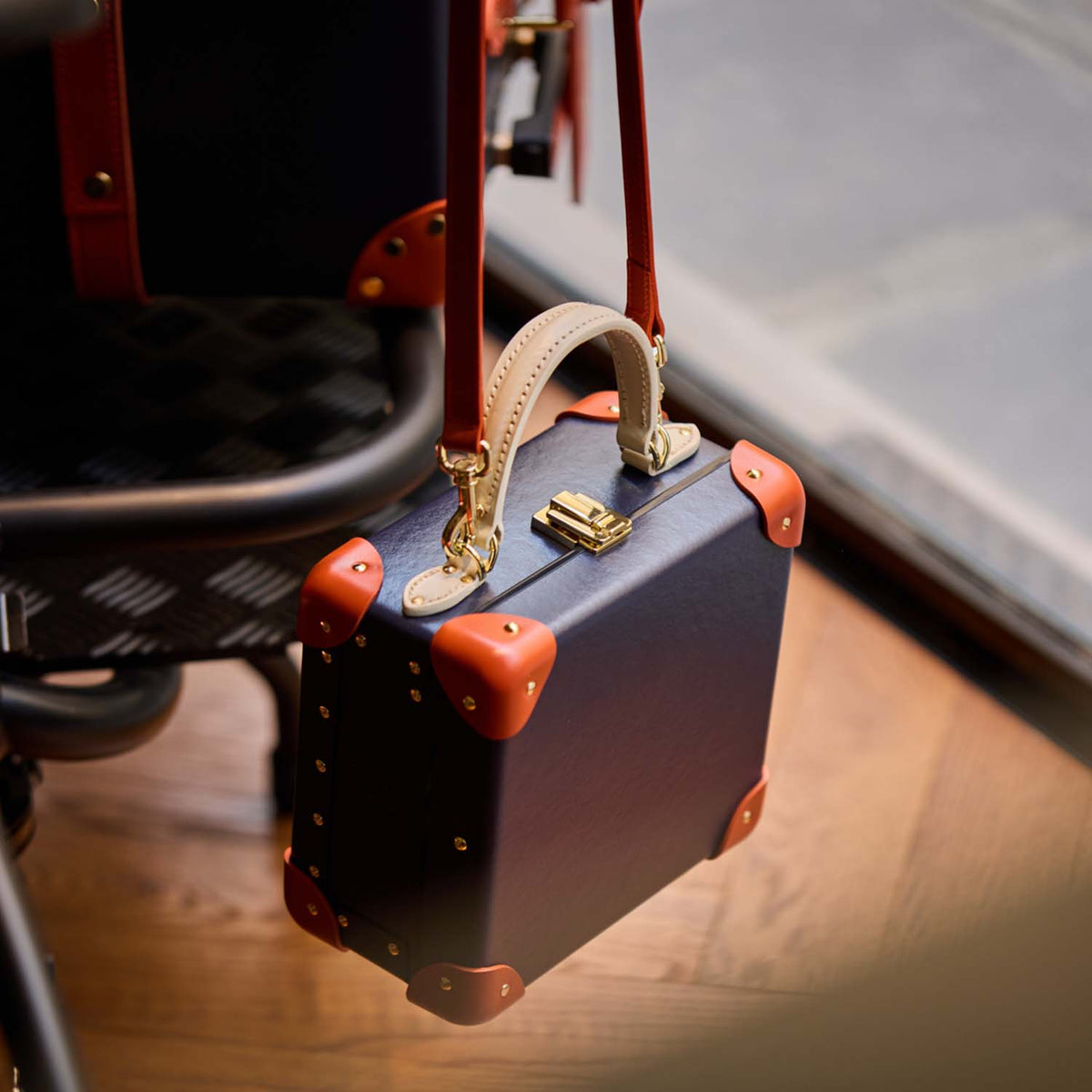 With an exterior colourway featuring a classic navy Vulcanised Fibreboard body, a bright Holiday Orange leather trim is used on the corners, handles, straps and strap guides.