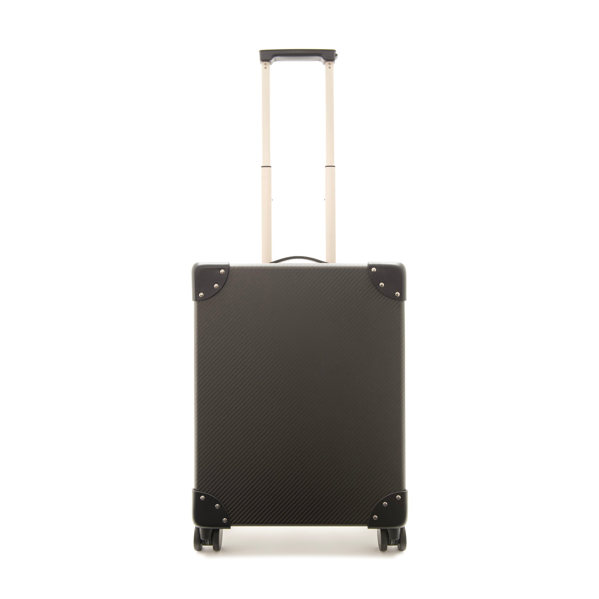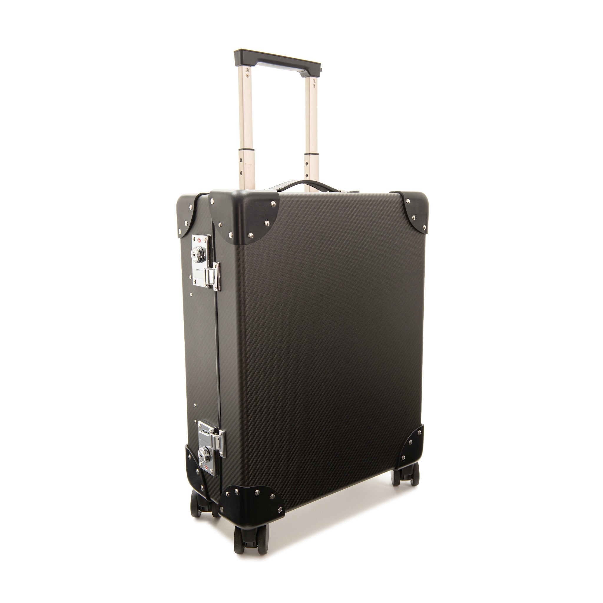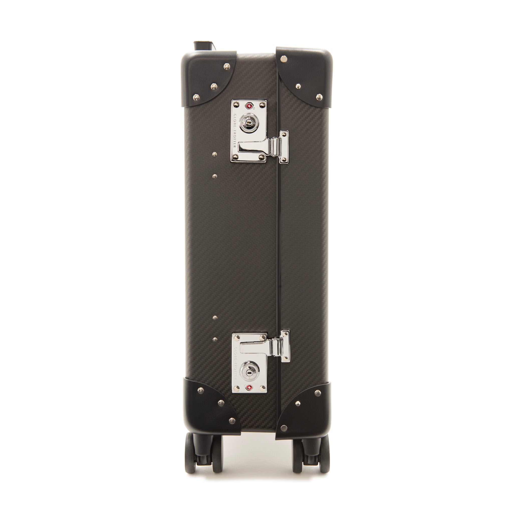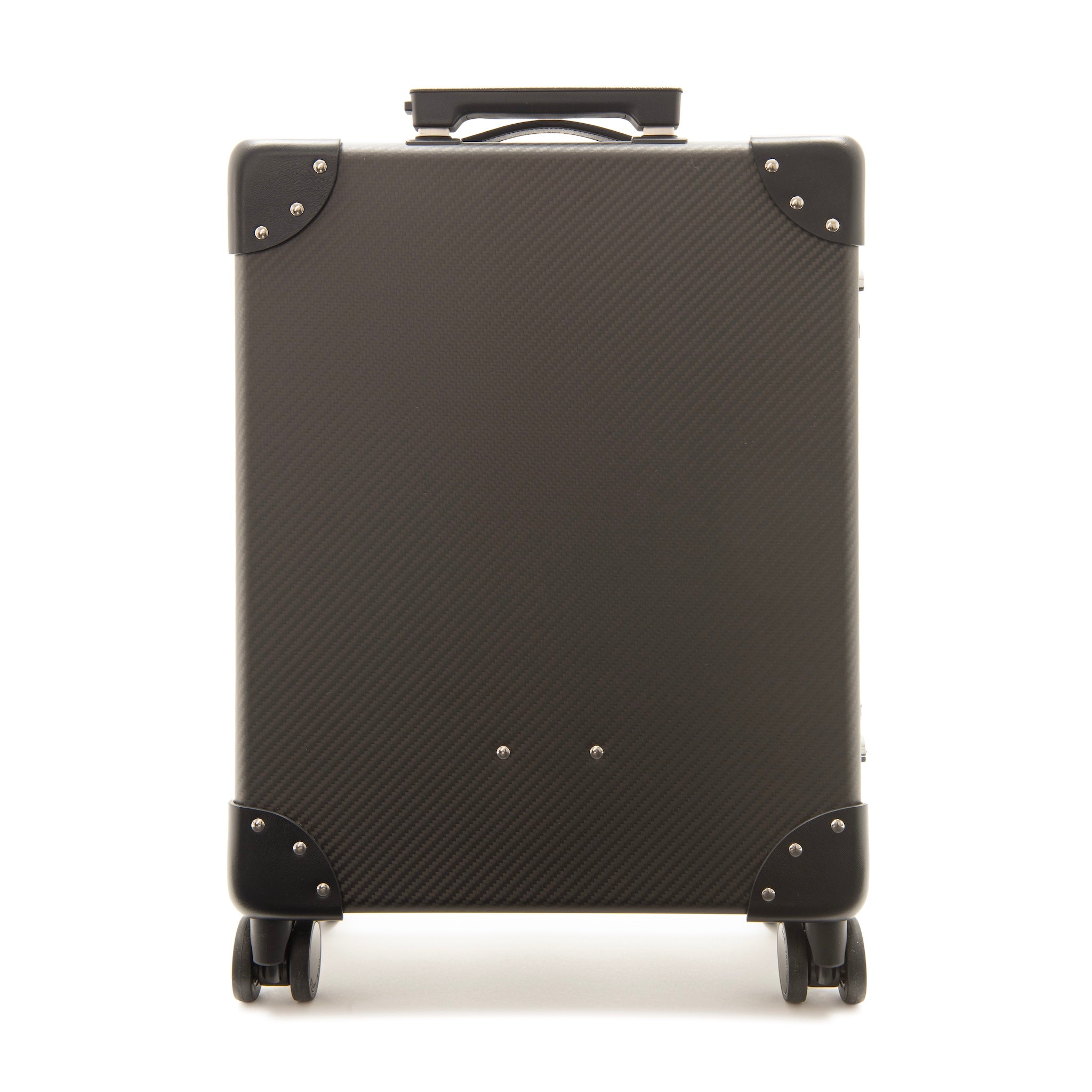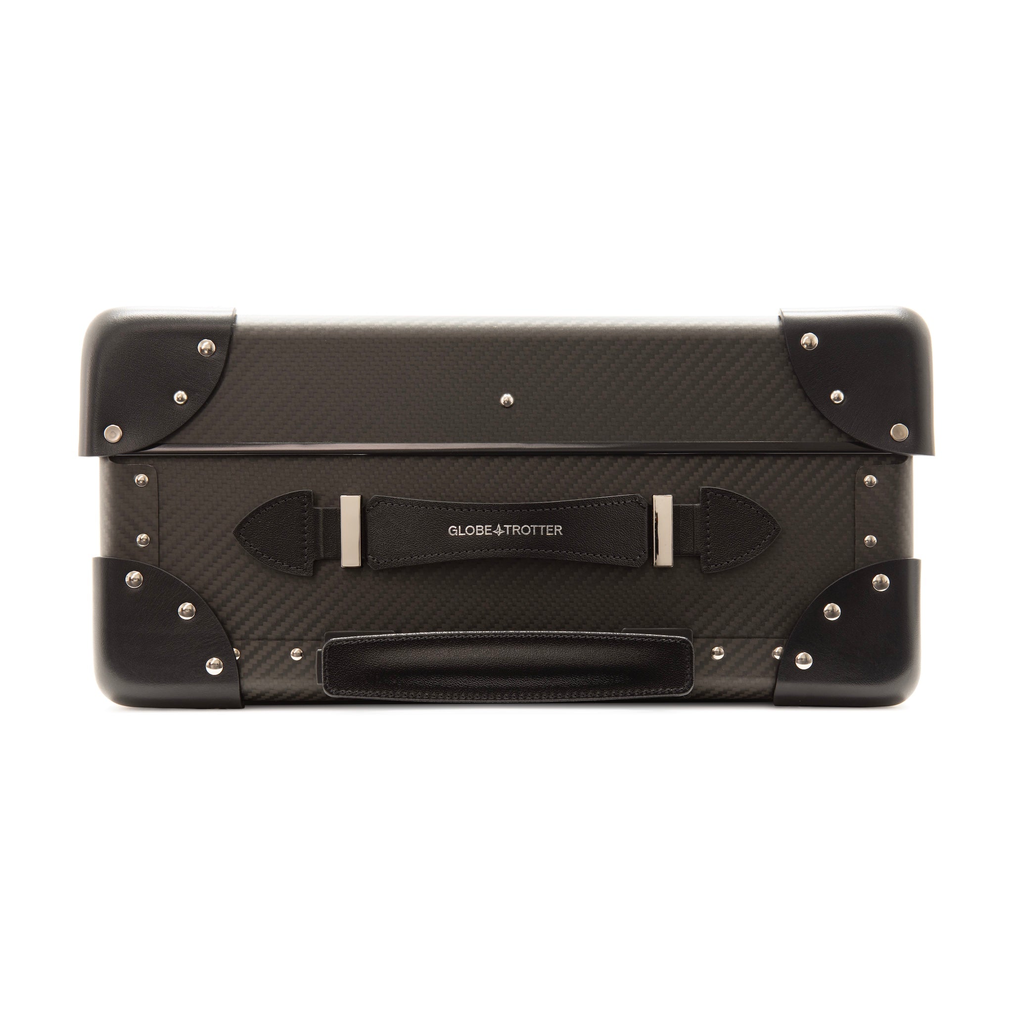 The exterior showcases a deep, sculpted carbon weave, complemented by handcrafted black leather corners, handles and trim. Polished chrome hardware provides a refined contrast, while the ergonomic handle and 4-wheel system ensure effortless movement through airports and city streets.