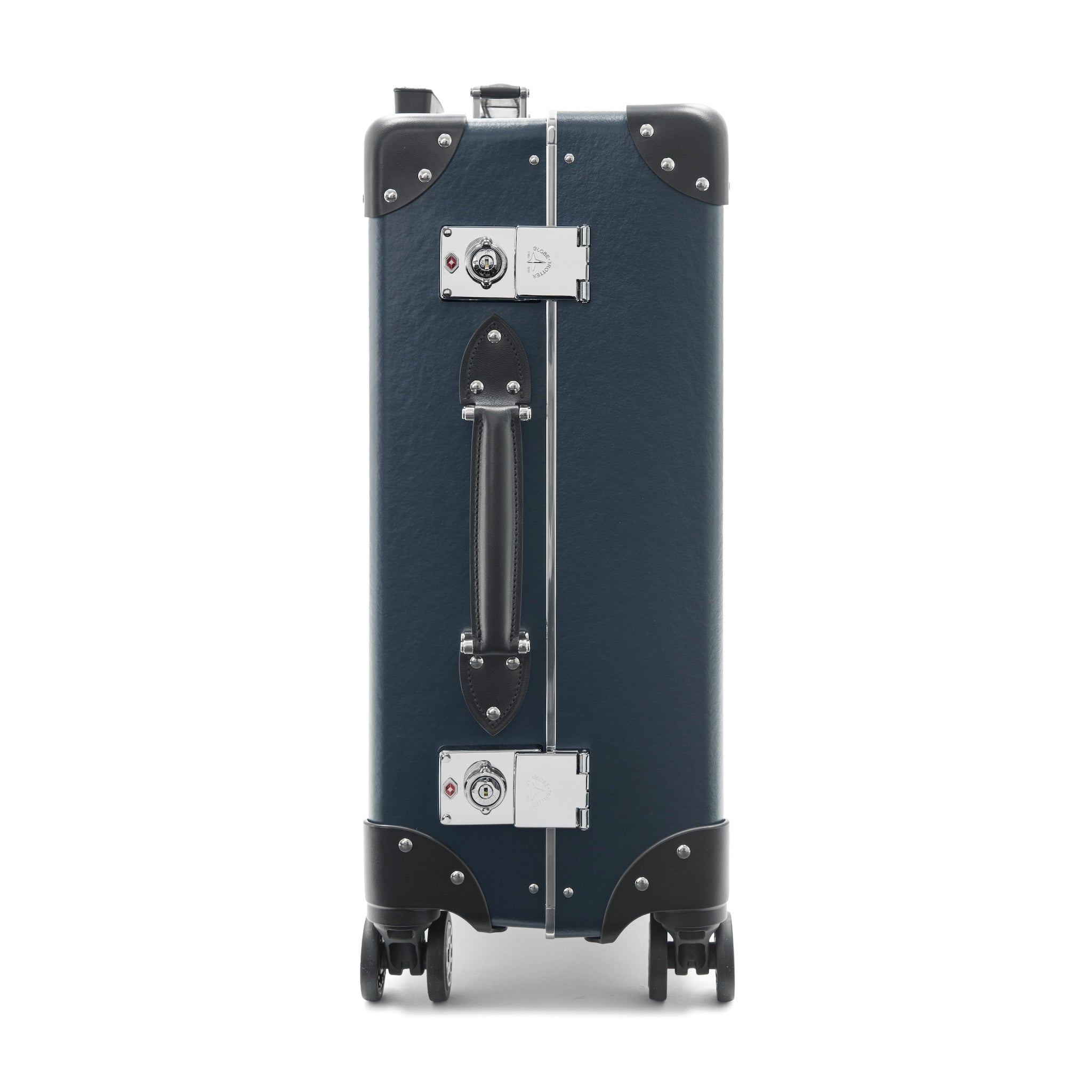 The deep navy body is paired with black trim and polished chrome hardware for a crisp, architectural finish. Inside, the innovative zip-in lining keeps belongings secure and neatly arranged, while the newly designed hubcap wheels inspired by automotive design ensure smooth, effortless movement. TSA-approved locks complete the case, offering security with elegance.
