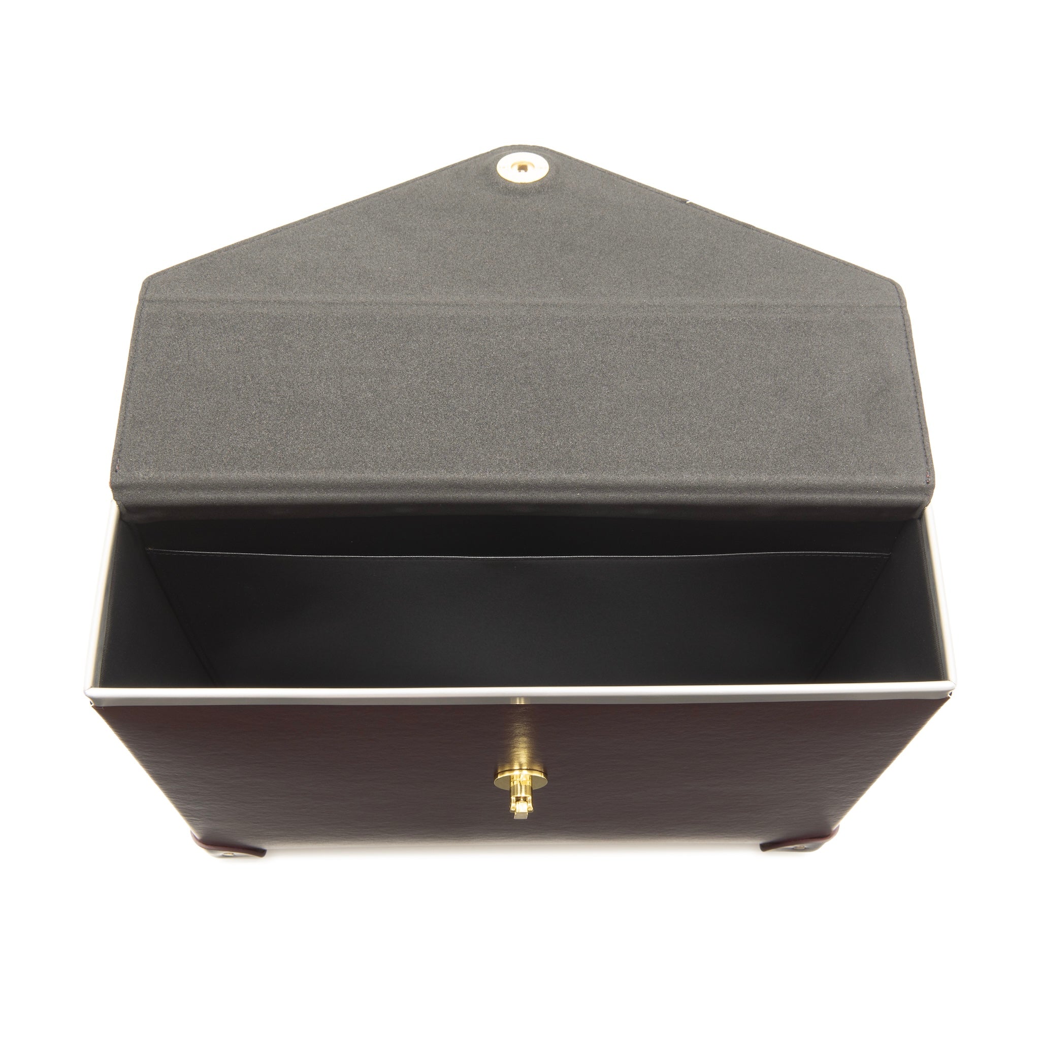 Its structured silhouette is framed with Burgundy leather corners, a matching flat leather handle, and polished brass rivets that reflect the signature detailing of the Original Collection. Protective foot studs at the base provide stability when placed upright, whether during meetings on the move or when stored neatly in the office.